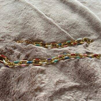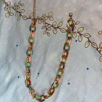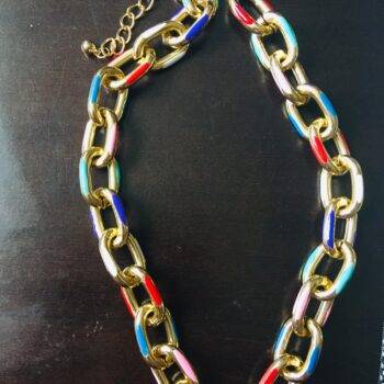 A good chain of gold metal with colored inserts. Not heavy, does not ring when worn. Very beautiful decoration. The chain is the same as in the photo. Looks stylish, not cheap. I absolutely like it!