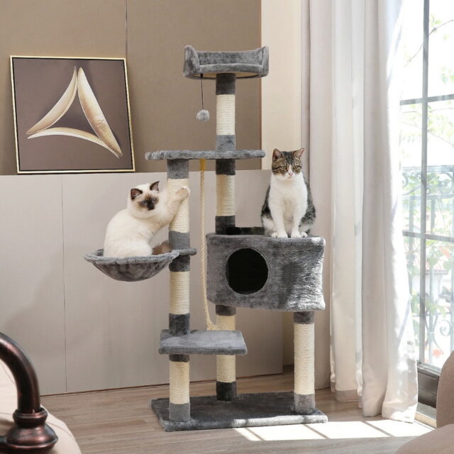 With multiple levels and activities in one piece, this cat tree reduces boredom and promotes exercise. Active play supports fitness, helps manage weight, and keeps energy focused on positive ways.
