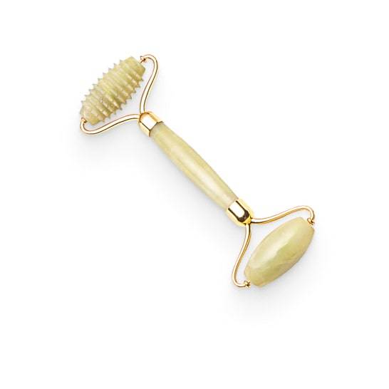 This handheld Jade Facial Roller has two jade stone heads: a bigger one is for the forehead, cheekbone, and chin areas; a smaller one is for the under-eye area.